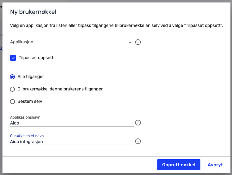 Kopier nøkkelen (denne nøkkelen skal ikke deles med noen andre enn Aido).